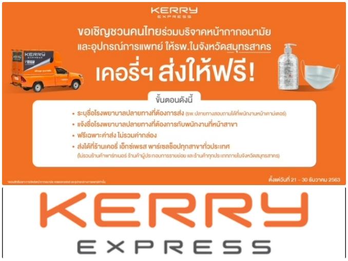 บริษัท เคอรี่ เอ็กซ์เพรส (ประเทศไทย) จำกัด (มหาชน) เชิญชวนคนไทยมาร่วมกันบริจาคหน้ากากอนามัย เจลแอลกอฮอล์ และอุปกรณ์ทางการแพทย์ โดยไม่คิดค่าจัดส่ง ตั้งแต่วันที่ 21 – 30 ธันวาคม 2563 ไปยังโรงพยาบาลในเขตจังหวัดสมุทรสาคร ดังนี้