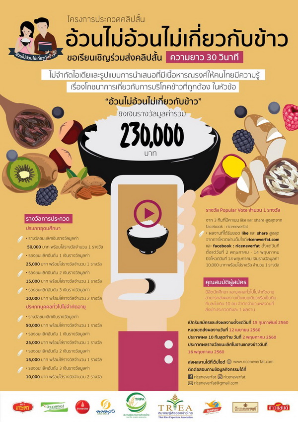 ติดตามรายละเอียดโครงการประกวดโครงการประกวดคลิปสั้น 30 วินาที ในหัวข้อ “อ้วนไม่อ้วนไม่เกี่ยวกับข้าว” ได้ที่ Facebook : อ้วนไม่อ้วนไม่เกี่ยวกับข้าว, www.riceneverfat.com, Instagram : Riceneverfat, Youtube Channel : Riceneverfat, Email : riceneverfat@gmail.com