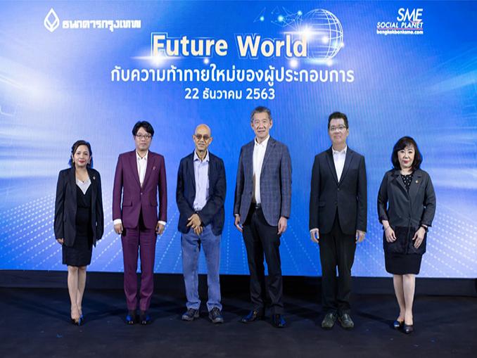 นายวีระศักดิ์ สุตัณฑวิบูลย์ (ที่ 3 จากซ้าย) รองผู้จัดการใหญ่ ธนาคารกรุงเทพ จำกัด (มหาชน) พร้อมคณะผู้บริหารธนาคารกรุงเทพร่วมให้การต้อนรับ ดร.พันธุ์อาจ ชัยรัตน์ (ที่ 2 จาก ขวา) ผู้อำนวยการสำนักงานนวัตกรรมแห่งชาติ (องค์การมหาชน) NIA และคุณกฤษณ์ พันธ์รัตนมาลา (ที่ 2 จากซ้าย) กรรมการผู้จัดการ บริษัท บัวหลวงเวนเจอร์ส จำกัด เนื่องในโอกาสการเป็นวิทยากรในงานสัมมนาออนไลน์ซึ่งจัดโดยธนาคารกรุงเทพฯ ภายใต้หัวข้อ “Future World กับความท้าทายใหม่ของผู้ประกอบการ” วิเคราะห์เจาะลึก แนวโน้มอนาคตในทุกมิติ ไม่ว่าจะเป็นมิติด้านเศรษฐกิจ สังคม เทคโนโลยี สิ่งแวดล้อมและการศึกษา ตลอดจนความเสี่ยงต่างๆ ที่อาจจะเกิดขึ้น เพื่ออัพเดทข้อมูลและเตรียมความพร้อมให้ภาคธุรกิจได้กำหนดกลยุทธ์รับมือได้อย่างเหมาะสมตามสถานการณ์ ดำเนินรายการโดย คุณสุทธิชัย หยุ่น นักสื่อสารมวลชนแถวหน้าของเมืองไทย