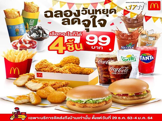 หยุดยาวนี้ แมคดิลิเวอรีพร้อมส่งความอร่อยถึงที่ แบบไม่มีเงื่อนไข อร่อยฟิน 4 เมนู เพียง 99 บาทเท่านั้น เลือกได้ตามใจทั้ง เบอร์เกอร์หมู, เบอร์เกอร์ไก่เปปเปอร์, ชิคสติ๊ก 2 ชิ้น, แมควิงส์ 2 ชิ้น, แมคนักเก็ต 4 ชิ้น, เฟรนช์ฟรายส์ขนาดกลาง 1 กล่อง, ซันเดช็อกโกแลต, ซันเดสตรอว์เบอร์รี, พายข้าวโพด, พายสับปะรด, เครื่องดื่มเย็นสดชื่นขนาด 16 ออนซ์ เลือกได้กับโค้ก, โค้กไม่มีน้ำตาล, สไปร์ท, แฟนต้าสตรอว์เบอร์รี, กาแฟเย็น, โอวันตินเย็น, ชามะนาวเย็น, ชานมเย็น โปรโมชั่นเริ่มวันที่ 29 ธันวาคม 2563 - 4 มกราคม 2564 เพียง 7 วันเท่านั้น ค่าจัดส่ง 40 บาททุกออเดอร์ ไม่มีขั้นต่ำ คุ้มแบบนี้ห้ามพลาด