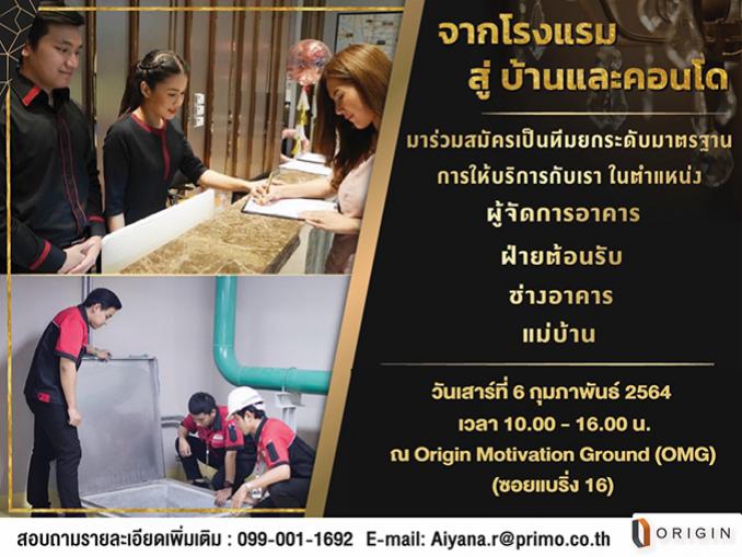สำหรับในปีนี้ ออริจิ้น พร็อพเพอร์ตี้ ขอเดินหน้าให้กำลังใจเติมพลัง “สู้ไปด้วยกัน” ด้วยการช่วยเหลือพนักงานกลุ่มธุรกิจท่องเที่ยวและโรงแรมที่ได้รับผลกระทบจากการระบาดโควิด-19 ระลอกใหม่ กลับมาอีกครั้งกับการโครงการ “Service Ambassador รุ่นที่ 2” รับสมัครในหลายตำแหน่งไม่ว่าจะเป็น ผู้จัดการอาคารที่มีประสบการณ์ Front Manager หรือ Duty Manager จากโรงแรมต่างๆ รวมไปถึงช่างโรงแรม และแม่บ้านโรงแรม ให้เข้ามาเป็นส่วนหนึ่งของทีมบริการลูกบ้านของออริจิ้น ผู้สนใจสามารถเข้ามา WALK-IN INTERVIEW ในวันเสาร์ ที่ 6 กุมภาพันธ์ นี้ เวลา 10.00 – 16.00 น. ณ Origin Motivation Ground (OMG) ซอยแบริ่ง 16 ติดต่อสอบถามรายละเอียดเพิ่มเติม ได้ที่ 099 001 1692