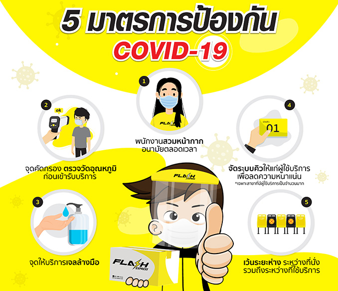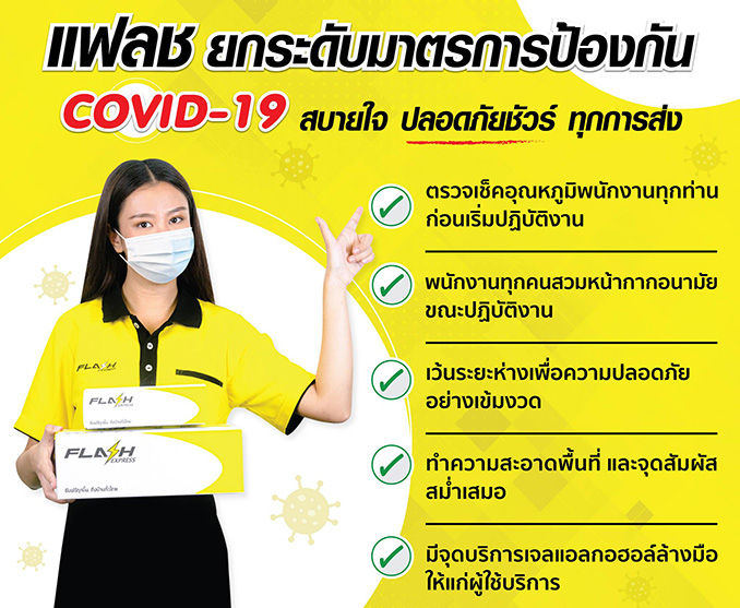 นางจรัสพักตร์ การปลื้มจิตต์ พาร์ทเนอร์กลุ่มธุรกิจ แฟลช (Flash Group) กล่าวว่า จากการประกาศการยกระดับมาตรการป้องกัน COVID-19 ที่มีการระบาดระลอกใหม่จากภาครัฐ บริษัทฯ ตระหนักถึงความสำคัญต่อสถานการณ์ดังกล่าวเป็นอย่างมาก และได้มีนโยบายยกระดับคุมเข้มมาตรการป้องกันขั้นสูงสุด พร้อมเน้นย้ำพนักงานขนส่งพัสดุทุกคนต้องสวมใส่หน้ากากอนามัยตลอดเวลาที่นำส่งและเข้ารับพัสดุของลูกค้าผู้ใช้บริการ พร้อมกันนี้ในส่วนของคลังสินค้า (HUB) ศูนย์กระจายสินค้า (DC) และจุดรับส่งพัสดุที่มีอยู่ทั่วไทยกว่า 10,000 แห่งจะต้องป้องกัน และเฝ้าระวังอย่างรัดกุมเพื่อสร้างความปลอดภัยให้เกิดขึ้นอย่างสูงสุด อาทิ การฉีดพ่นฆ่าเชื้ออย่างสม่ำเสมอ รวมถึงให้แต่ละสาขาเพิ่มความถี่ในการทำความสะอาด พร้อมให้บริการลูกค้าแบบเว้นระยะห่าง Social Distancing ยิ่งไปกว่านั้นทุกสาขาจะต้องมีการวัดอุณหภูมิ และเจลแอลกอฮอลล์ ตั้งไว้เพื่อให้บริการแก่ลูกค้าที่เข้ามาใช้บริการ ทั้งนี้บริษัทฯ ยังได้เพิ่มสวัสดิการเป็นเงินพิเศษทุกเดือนให้แก่ พนักงานคูเรียร์, พนักงานประจำคลังสินค้า (HUB), ศูนย์กระจายสินค้า (DC) และสาขา (SHOP) ไว้สำหรับซื้ออุปกรณ์จำพวกหน้ากากอนามัย และเจลแอลกอฮอลล์ เพื่อดูแลและป้องกันตนเองจากเชื้อไวรัส COVID-19