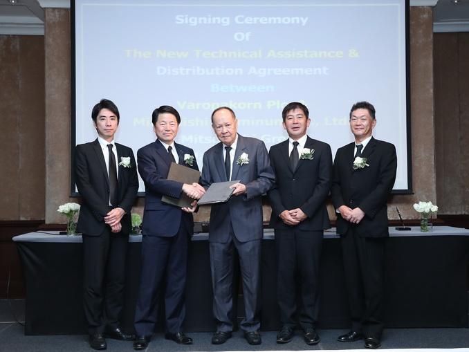 นายสันชัย ชัยเฉนียน (กลาง) ประธานกรรมการ และประธานเจ้าหน้าที่บริหาร บริษัทวโรปกรณ์ จำกัด (มหาชน) ผู้ผลิตอลูมิเนียมรีดเย็นชั้นนำของไทยร่วมลงนามการต่ออายุสัญญาการให้ความช่วยเหลือทางเทคนิค และการจัดจำหน่ายกับ มร.อาคิโอะ ฮามาจิ (ที่ 2 จากซ้าย) ประธานบริษัท บริษัท มิตซูบิชิ อลูมินัม จำกัด ซึ่งเป็นหนึ่งในกลุ่มผู้ผลิตอลูมิเนียมระดับไฮเอ็นด์ (high-end) ของโลก โดยมิตซูบิชิฯ จะถ่ายทอดเทคโนโลยีในการผลิตแผ่นอลูมิเนียมฟินสต็อกชนิดใหม่สำหรับการแลกเปลี่ยนความร้อนในรถยนต์ และสำหรับเครื่องปรับอากาศ รวมถึงผลิตภัณฑ์ใหม่อื่น ๆ โดยมี มร.ฮิโตชิ โฮริเอะ (ซ้าย) ผู้จัดการอาวุโส แผนกอลูมินั่ม บริษัท มิตซูบิชิ คอร์ปอเรชั่น อาร์ทีเอ็ม เจแปน จำกัด, มร.โยชินาโอะ โตโยดะ (ที่ 2 จากขวา) ประธานบริษัท เอ็มเอแอลซี-ไทย จำกัด และ มร.โทชิอากิ ซาซากิ (ขวา) ประธานเจ้าหน้าที่ปฏิบัติการ แผนกโลหะ บริษัท ไทย-เอ็มซี จำกัด เข้าร่วมเป็นสักขีพยาน ณ โรงแรมอินเตอร์คอนติเนนตัล กรุงเทพฯ เมื่อเร็ว ๆ นี้