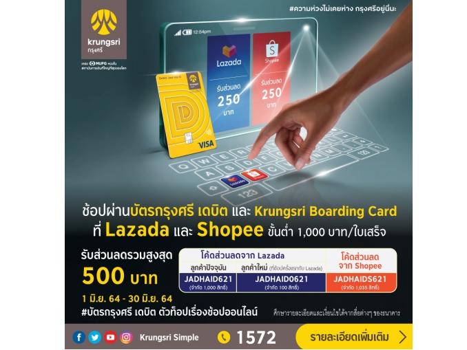 กรุงศรี (ธนาคารกรุงศรีอยุธยา จำกัด (มหาชน)) แจกโค้ดลดสุดคุ้ม เอาใจนักช้อปออนไลน์โดยเฉพาะ จับมือ Lazada และ Shopee จัดแคมเปญ “รับโค้ดคุ้ม ลดรายเดือน 500 บาท กับบัตรกรุงศรี เดบิต และ Krungsri Boarding Card” มอบส่วนลดรวมสูงสุด 500 บาท แก่ลูกค้าเมื่อช้อปขั้นต่ำ 1,000 บาทต่อใบเสร็จ ผ่านบัตรกรุงศรี เดบิต และ Krungsri Boarding Card บน Lazada หรือ Shopee โดยลูกค้าสามารถใช้โค้ดเพื่อรับส่วนลด 250 บาท JADHAID621 สำหรับลูกค้าปัจจุบันของ Lazada และใช้โค้ด JADHAID0621 สำหรับลูกค้าใหม่ ส่วนการช้อปบน Shopee สามารถใช้โค้ด JADHAIDS621 ได้ทั้งลูกค้าปัจจุบันและลูกค้าใหม่ สงวนสิทธิ์การใช้โค้ด 1 สิทธิ์/บัญชีผู้ใช้ ตั้งแต่วันนี้ – 30 มิ.ย. 64 หรือจนกว่าสิทธิ์จะหมด