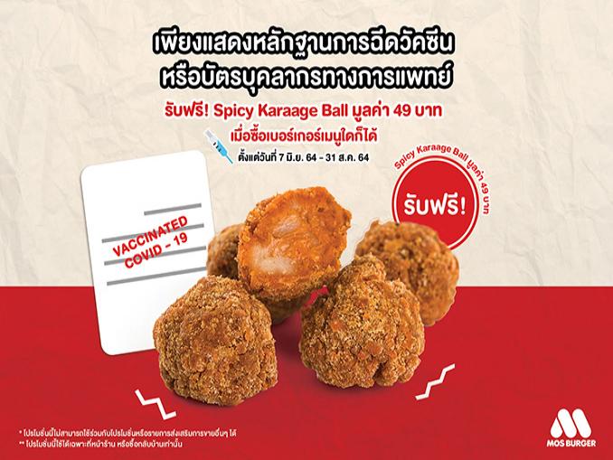 มอส เบอร์เกอร์ (MOS BURGER) ขอร่วมเป็นส่วนหนึ่งในการสนับสนุนการฉีดวัคซีนโควิด-19 และเชิญชวนให้คนไทยฉีดวัคซีนเพื่อสร้างภูมิคุ้มกันหมู่ให้สามารถกลับมาใช้ชีวิตตามปกติได้โดยเร็ว โดยได้จัดแคมเปญมอบสิทธิพิเศษสำหรับผู้ที่ผ่านการฉีดวัคซีนป้องกันโควิด19 และบุคลากรทางการแพทย์ทุกท่าน เพียงแสดงบัตรรับรองการฉีดวัคซีน หรือ แสดงบัตรบุคลากรทางการแพทย์ รับฟรี Spicy Karaage Ball มูลค่า 49 บาท เมื่อซื้อเบอร์เกอร์เมนูใดก็ได้ ตั้งแต่วันนี้ - 31 สิงหาคม 2564 หรือจนกว่าจะมีการเปลี่ยนแปลง ที่ร้านมอส เบอร์เกอร์ ทุกสาขาทั่วประเทศ (โปรโมชันนี้ใช้ได้เฉพาะที่ซื้อกลับบ้านเท่านั้น ไม่สามารถใช้ร่วมกับโปรโมชันอื่นๆ ได้)