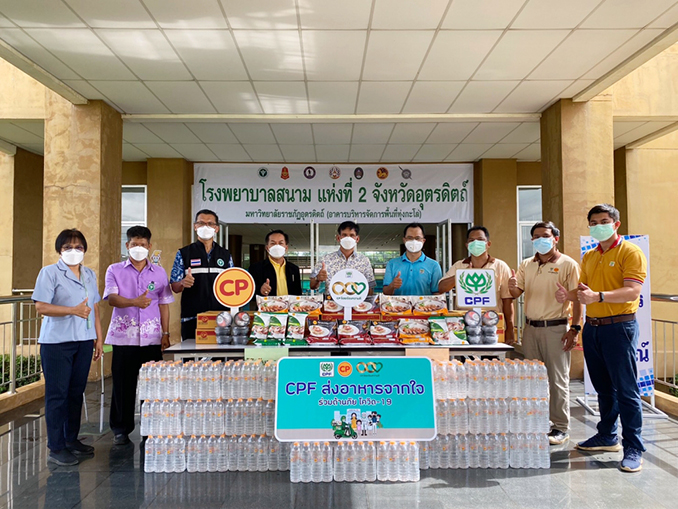 บริษัท เจริญโภคภัณฑ์อาหาร จำกัด (มหาชน) หรือซีพีเอฟ มอบอาหารสำเร็จรูปพร้อมรับประทานและน้ำดื่มในโครงการ “CPF ส่งอาหารจากใจ ร่วมต้านภัยโควิด-19” ตามนโยบายเครือเจริญโภคภัณฑ์ แก่ นายสมชาย ทองกระสัน รองนายแพทย์สาธารณสุข จ.อุตรดิตถ์ เพื่อเป็นกำลังใจให้บุคลากรทางการแพทย์ ตลอดจนเจ้าหน้าที่ในภารกิจเฝ้าระวังและป้องกันแพร่ระบาดของโรคโควิด โดยมีนายชัยราช อุดแบน ผู้แทนซีพีเอฟ นำชาวซีพีเอฟจิตอาสากลุ่มธุรกิจสุกร ร่วมมอบ ณ โรงพยาบาลสนาม แห่งที่ 2 มหาวิทยาลัยราชภัฏอุตรดิตถ์ (ทุ่งกะโล่) จ.อุตรดิตถ์