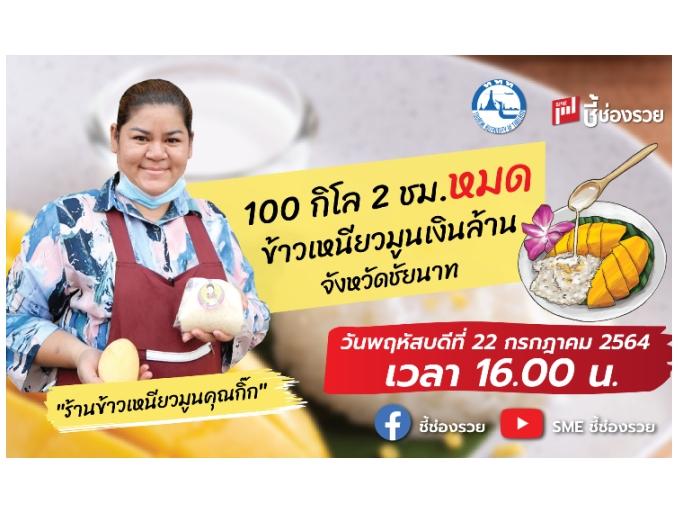 โควิด 19 ไม่อาจปิดกั้นความอร่อย ชี้ช่องรวยช่วยท่องเที่ยวชวนท้าพิสูจน์ของดีจังหวัดชัยนาท "ร้านข้าวเหนียวมูนคุณกิ๊ก" สตรีทฟู้ดชื่อดัง ยอดชมคลิป 4.5 ล้านวิว ต่อคิวรอแต่เช้า ทำขายวันละ 100 กิโลกรัม ไม่ถึง 2 ชั่วโมงหมด!! อร่อยจนต้องยอม ข้าวเหนียวขึ้นเงา เม็ดสวย หอม หวาน นุ่ม ละมุนลิ้น คนขายใจดีสอนสูตรคนอยากมีอาชีพสู้วิกฤติโควิด-19 และไม่พลาดแนะนำสถานที่ท่องเที่ยวอันเป็นไฮไลท์เด็ดของชัยนาทสักครั้งต้องมาเยือน ติดตามรับชมได้ในวันพฤหัสบดีที่ 22 กรกฎาคมนี้ เวลา 16.00 น. ทาง Facebook: ชี้ช่องรวย และ YouTube: SME ชี้ช่องรวย