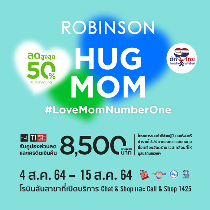 โดยแคมเปญ “Central Luv Mom” และ “Robinson Hug Mom” เป็นหนึ่งในความพิเศษจากแคมเปญใหญ่ “Central / Robinson Shop Shop #HUGTHAIS ไทยช่วยไทย รวมใจช้อป” ที่เป็นการผนึกกำลังจากทุกธุรกิจในเครือกลุ่มเซ็นทรัล เพื่อร่วมทำภารกิจแห่งชาติกระตุ้นเศรษฐกิจไทย ให้ขับเคลื่อนไปในทิศทางบวกยิ่งขึ้น ซึ่งลูกค้าที่สนใจสามารถดูรายละเอียดเพิ่มเติมได้ที่เว็บไซต์ www.central.co.th, www.robinson.co.th หรือที่เฟซบุ๊กเพจ Central Department Store และ Robinson Department Store รวมถึงที่เฟซบุ๊กเพจแต่ละสาขาทั่วประเทศ