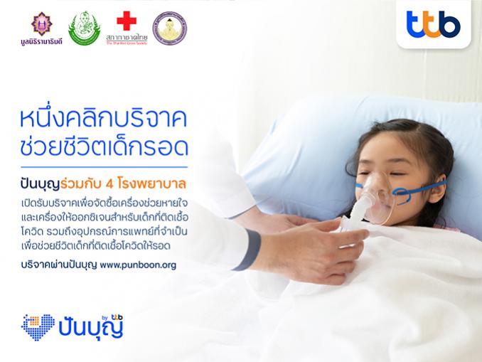 ปันบุญ โดยทีเอ็มบีธนชาต หรือ ทีทีบี (ttb) ขอเชิญร่วมต่อลมหายใจให้กับเด็กๆ ที่ติดเชื้อโควิด-19 ในโครงการ “หนึ่งคลิกบริจาค.. .ช่วยชีวิตเด็กรอด” โดยร่วมกับ 4 โรงพยาบาล ได้แก่ มูลนิธิโรงพยาบาลรามาธิบดี, ศิริราชมูลนิธิ, โรงพยาบาลจุฬาลงกรณ์ สภากาชาดไทย และมูลนิธิโรงพยาบาลเด็ก เปิดรับบริจาคเพื่อจัดซื้อเครื่องช่วยหายใจ เครื่องให้ออกซิเจน และอุปกรณ์ทางการแพทย์ที่จำเป็น เพื่อช่วยชีวิตเด็กติดเชื้อโควิด-19