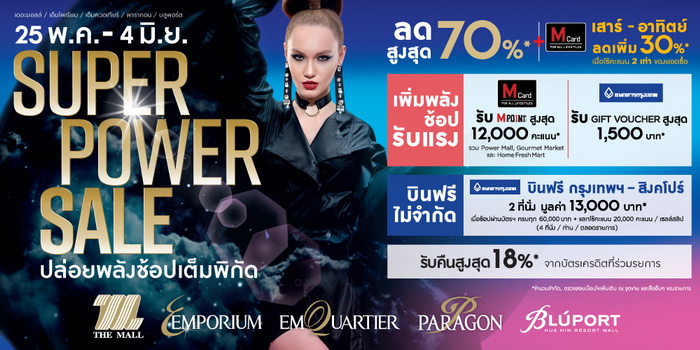 ห้างสรรพสินค้าในกลุ่มเดอะมอลล์ กรุ๊ป จับมือ บัตรเครดิตธนาคารกรุงเทพ จัดแคมเปญ “Super Power Sale : ปล่อยพลังช้อปเต็มพิกัด” แจกบัตรกำนัลกระตุ้นนักช้อปสูงสุด 1,500 บาท และ ตั๋วเครื่องบิน ไป-กลับ กรุงเทพ – สิงคโปร์ ไม่จำกัดจำนวนพร้อมความพิเศษมากมายจากบัตร M Card ระหว่างวันที่ 25 พฤษภาคม - 4 มิถุนายน 2560 ที่ เดอะมอลล์ ทุกสาขา เอ็มโพเรียม, เอ็มควอเทียร์, พารากอน ดีพาร์ทเม้นต์สโตร์ และบลูพอร์ต หัวหิน