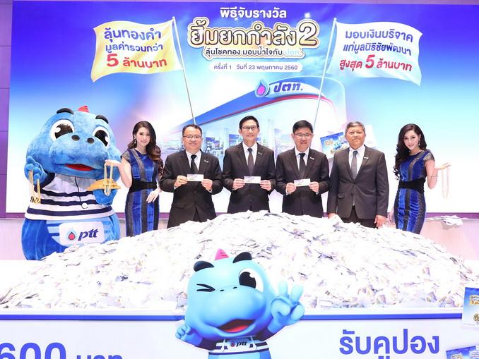 คุณอรรถพล ฤกษ์พิบูลย์ รองกรรมการผู้จัดการใหญ่หน่วยธุรกิจน้ำมัน บริษัท ปตท. จำกัด (มหาชน) เป็นประธานในพิธีจับรางวัลกิจกรรมส่งเสริมการขาย “ยิ้มยกกำลังสอง” ครั้งที่ 1 ณ อาคารสำนักงานใหญ่ ปตท. โดยมีคณะผู้บริหารร่วมมอบโชคทองคำแท่งหนัก 10 บาท จำนวน 3 รางวัล และสร้อยคอทองคำหนัก 1 บาท จำนวน 30 รางวัล รวมมูลค่ากว่า 1,200,000 บาท